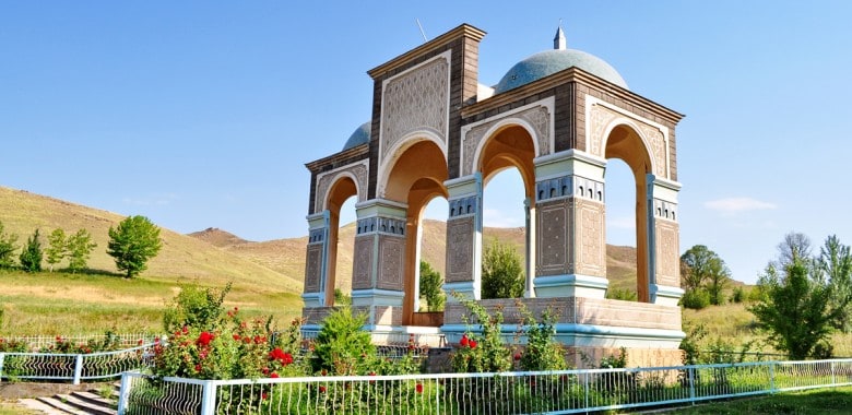 The hero Manas is said to be born in the Ala-Too Mountains in the Talas region in north-western Kyrgyzstan. A mausoleum a few kilometres east of the city of Talas is said to contain his remains and is a popular excursion and festival site, where impressive Kyrgyz equestrian games have been staged since 1995. However, one of the facade inscriptions states that the mausoleum is dedicated to "the most glorious of women, Kenizek-Khatun, the daughter of the Emir Abuka". Legend has it that Kanikey, the widow of Manas, ordered this inscription to mislead her husband's enemies and prevent the tomb from being desecrated. The building, known as "Manastin Khumbuzu" was probably built in 1334. Nearby is a museum dedicated to Manas and his legend.