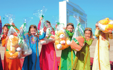 The traditional wedding is organized according to strictly established rules. It is a special festive ritual, which includes many customs and traditions associated with the people's idea of family prosperity, hard work, skills, ingenuity of newlyweds, strength of family and social ties. The wedding has always been the most joyous and solemn event, with traditional horse races, national wrestling called ‘goresh’, various national games and performances of singers – bakhshi and musicians. Moreover, the Turkmen wedding and its rituals are full of funny moments, including in taking the bride away from her native house, testing her dexterity and ability to untie the groom's gushak (belt) tied into a tricky knot with a bandage over her eyes, and many others. The wedding maiden songs, as well as the ditties sung by children who move from house to house according to the customs of Novruz (the national spring festival) are replete with wits.