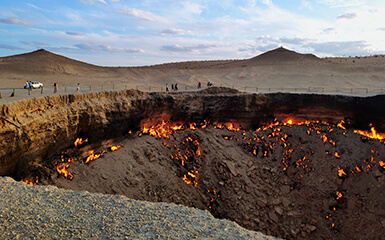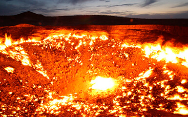 Fifty years old shining torch of Karakum Desert in the Central Asia. This is not a story, not a legend, it is real! The fire may have existed to avoid poisonous methane gas discharge, by burning off the gas, and while geologists had hoped the fire would consume the fuel in a few days, the gas is still burning fifty years later. The name of the crater is older than it. Darvaza (Derweze in Turkmen ‘Gate’ in English) district is in the middle of desert area and have one of the biggest gas reserves in the world.