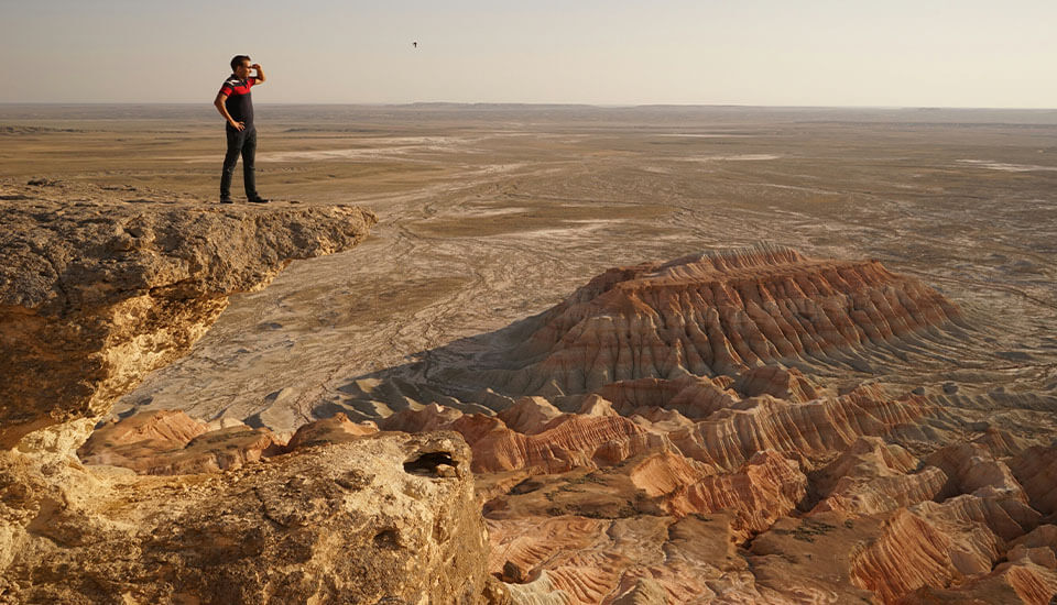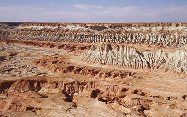 The canyons are incredibly stunning. Leaving Balkanabat through a lifeless flat desert, you suddenly find yourself at steep cliffs, going hundreds of meters deep. Once upon a time, the waters of the ancient sea splashed here (and now from many points one can see the waters of the Karabagazkol, which was formerly part of the Caspian Sea). The sea has left, revealing steep shores and huge hills. Waves, wind and rains have created quaint castles, towers, walls here. The colors of the rocks, from pure white to fiery red, create a magical beauty. And the mountains change its colors right away depending on the time of a day and lighting. And they are extremely beautiful at sunset, when everything is surrounded by fiery tones.