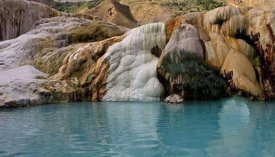 The mineral waters that come out on the surface of the Garm Chashma springs from the very depths of the earth, from the ancient crystalline and metamorphic rocks, resemble a fountain. Over the course of many centuries, travertine hills with a height of 7-8 meters and a length of 1500 meters have formed around them, with wonderful ledges flowing down to the river.