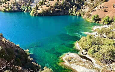 Lake Timur-Dara - a dammed origin - is located an hour's walk from the Karatag River, at an altitude of 1970 m above sea level. The path leading to the lake starts from a small river with the same name Timur-Dara, which flows out of the lake and flows into the Karatag river. The lake itself is located among the wooded slopes. Its water is bright blue. One of the shores is covered with coarse granite sand and can serve as an excellent beach.