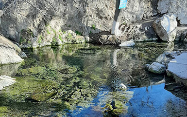 The waters that come from the springs and turn into a pool are extremely clear. You can easily see many fish jumping out of the shadows between the rocks. The pool has a blue-green hue, partially reflecting the sky and the green of the leaves of the trees above it.