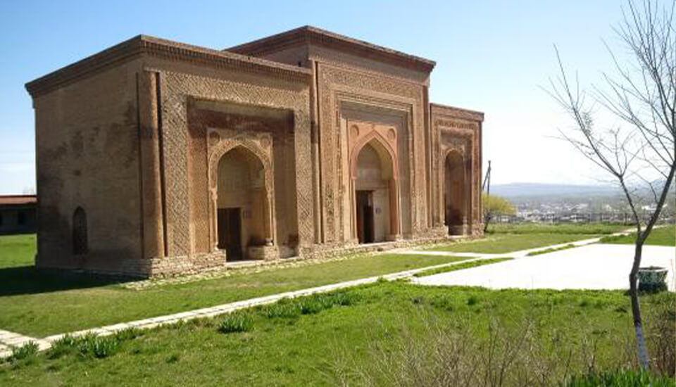 Several well-preserved buildings in the Uzgen archaeology-architecture-museum complex, on a park-like open space close to the city centre and next to the administrative building of Uzgen district, date from the heyday of the Karakhanids in the 11th and 12th centuries. On the north side of the complex is a minaret, which is only 27.5 m high today and is probably a model for the minarets built by the Karakhanids in Bukhara and Vobkent. The upper part of the 8.5 m wide tapering tower, which was originally much higher, was destroyed in an earthquake in the 16th century. Today, a dome over a viewing platform crowns it.
