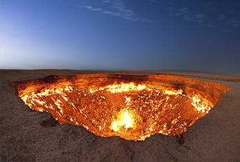 Breakfast at the hotel. Drive to Uzbekistan-Turkmenistan border, pass Shavat-Dashoguz border. Customs and passport control on both sides. Meet the Turkmen local guide and driver. Then drive to Kunya Urgench. Sightseeing tour in Kunya Urgench: visit Portal of Caravansaray, Mamun Minaret, II Arslan Mausoleum, Sultan Tekesh Mausoleum, Academy of Horezm, Kutlug Timur Minaret, Turabek Hanum Mausoleum. You will also visit Nejemeddin Kubra, Sultan Ali and Kryk Molla. Lunch at the local cafe. Then drive to Darwaza burning Gas Crater dubbed by locals as "The Door to Hell". The Darwaza area is rich in natural gas. While drilling in 1971, Soviet geologists tapped into a cavern filled with natural gas. The ground beneath the drilling rig collapsed, leaving a large hole with a diameter of 70 meters. To avoid poisonous gas discharge, it was decided the best solution was to burn it off. Geologists had hoped the fire would use all the fuel in a matter of days, but the as is still burning today. In the evening, watch the spectacular and fascinating view of the gas crater. BBQ dinner & overnight near the Gas Crater in a tent.